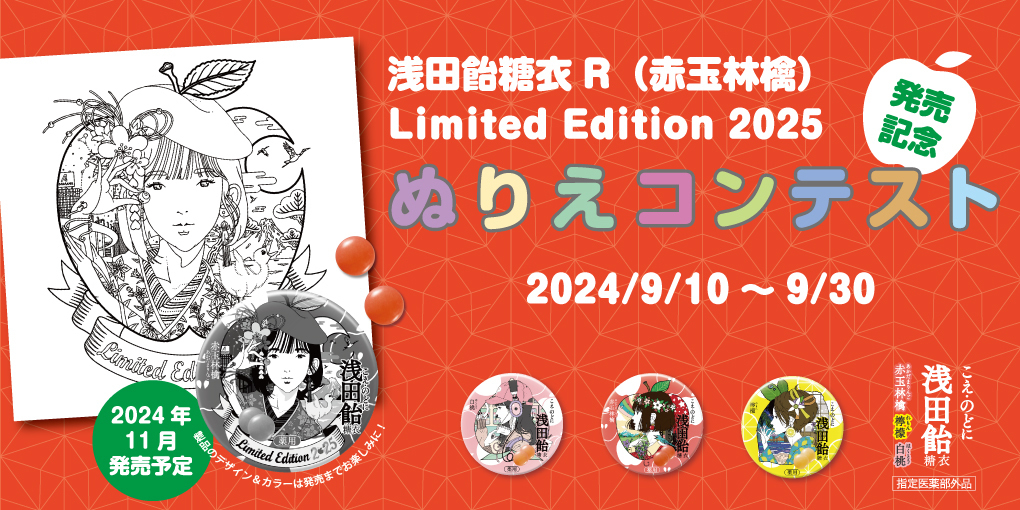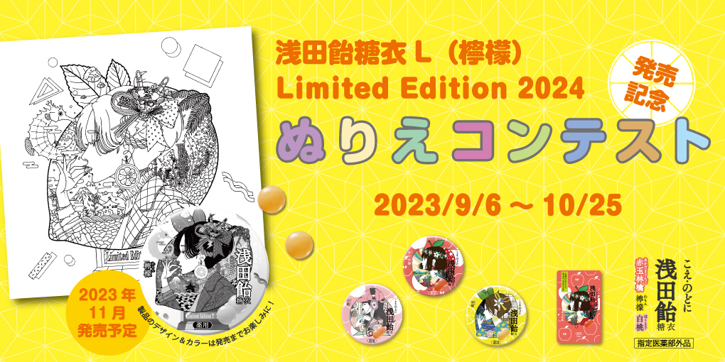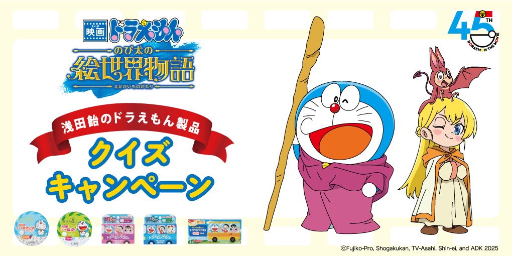 HOME 浅田飴のドラえもん製品 クイズキャンペーン 浅田飴のドラえもんシリーズに関するクイズに答えて『映画ドラえもん 新・のび太の海底鬼岩城』映画観賞券(ムビチケ)などをプレゼント! 応募締切:2026年2月16日(月) 詳しくはこちら 浅田飴糖衣キャンペーン 「浅田飴糖衣」の対象製品を購入、応募してくださった方の中から抽選で合計40名様に「浅田飴糖衣」オリジナルグッズなどをプレゼントいたします。 応募締切:2025年12月31日(水) 詳しくはこちら キミが考えた海のいきものイラストコンテスト きみの考えたオリジナルの海のいきものを大募集!イラストと名前、特長などを書いて応募してね!最優秀作品は映画のパンフレットに掲載! 応募締切:2026年1月7日(水) 詳しくはこちら #浅田飴ぬりえ コンテスト 2025年11月に発売予定の「浅田飴糖衣P(白桃)Limited Edition 2026」パッケージイラストのぬりえを大募集! 応募締切:2025年10月14日(火) 詳しくはこちら 浅田飴こども読み聞かせ会に親子100名様をご招待! 11月22日(土)文京区の文化シヤッターBXホールにて開催!読み聞かせや参加劇など、ちょっと早いクリスマスを親子で楽しみましょう! 応募締切:2025年9月30日(火) 詳しくはこちら 戦うのどに浅田飴 応援キャンペーン 9/20(土)大分トリニータvsレノファ山口FC(@クラサスドーム大分)にて浅田飴ブースを出展!対象商品の購入でオリジナルタオルをプレゼント! 試合開催日:2025年9月20日(土) 詳しくはこちら トラベロップQQ 楽しい旅行を応援キャンペーン 4月10日は「酔い止めの日」!トラベロップQQに関するクイズに答えて「どこでもドラえもん日本旅行ゲーム6」などをプレゼント! 応募締切:2025年4月30日(水) 詳しくはこちら 浅田飴のドラえもん製品 クイズキャンペーン 浅田飴のドラえもんシリーズに関するクイズに答えて『映画ドラえもん のび太の絵世界物語』映画観賞券(ムビチケ)などをプレゼント! 応募締切:2025年2月20日(木) 詳しくはこちら 絵にまつわるひみつ道具 絵のコンクール きみの考えた「絵にまつわるひみつ道具」を大募集!イラストと名前、特長などを書いて応募してね!きみの名前が映画のエンドロールに! 応募締切:2025年1月8日(水) 詳しくはこちら 浅田飴糖衣キャンペーン 「浅田飴糖衣」の対象製品を購入、応募してくださった方の中から抽選で合計40名様に「浅田飴糖衣」オリジナルグッズなどをプレゼントいたします。 第1回締切:2024年11月30日(土)/ 第2回締切:2024年12月31日(火) 詳しくはこちら #浅田飴ぬりえ コンテスト 2024年11月に発売予定の「浅田飴糖衣R(赤玉林檎)Limited Edition 2025」パッケージイラストのぬりえを大募集! 応募締切:2024年9月30日(月) 詳しくはこちら おおいたとのご縁キャンペーン 大分に関わる4社をフォロー&応募用ポストをリポストで、各社製品の詰め合わせをレゼント! 応募締切:2024年9月12日(木) 詳しくはこちら トラベロップQQ 楽しい旅行を応援キャンペーン 4月10日は「酔い止めの日」!トラベロップQQに関するクイズに答えて「ドラえもん ポケット人生ゲーム ひみつ道具で大冒険!」などをプレゼント! 応募締切:2024年4月22日(月) 詳しくはこちら 浅田飴のドラえもん製品 クイズキャンペーン 浅田飴のドラえもんシリーズに関するクイズに答えて『映画ドラえもん のび太の地球交響楽(ちきゅうシンフォニー)』映画観賞券(ムビチケ)などをプレゼント! 応募締切:2024年2月20日(火) 詳しくはこちら 音のなるオリジナルひみつ道具イラストコンテスト きみの考えた「音のなるオリジナルひみつ道具」を大募集!イラストと名前、特長などを書いて応募してね!最優秀作品は映画のパンフレットに掲載! 応募締切:2024年1月9日(火) 詳しくはこちら 11/22 桂小すみ ひとり会 にご招待! 全国の大人と子どもが笑いでつながる!桂小すみ ひとり会 ~第8回「声」でつながる演芸会~のオンライン配信視聴チケットをプレゼント! 応募締切:2023年11月14日(火) 詳しくはこちら シュガーカット50周年キャンペーン 第3弾 シュガーカットは今年で発売50周年!感謝を込めて、ロカボやレトロな賞品が当たるプレゼントキャンペーンを実施中です! 応募締切:2023年12月31日(日) 詳しくはこちら 浅田飴糖衣キャンペーン 「浅田飴糖衣」の対象製品を購入、応募してくださった方の中から抽選で合計40名様に「浅田飴糖衣」オリジナルグッズなどをプレゼントいたします。 第1回締切:2023年11月30日(木)/ 第2回締切:2023年12月31日(日) 詳しくはこちら 浅田飴こども読み聞かせ会に親子100名様をご招待! 10月28日(土)文京区の文化シヤッターBXホールにて開催!ハロウィンにちなんだ人形劇や読み聞かせ、参加劇など親子で楽しみましょう! 応募締切:2023年9月30日(土) 詳しくはこちら #浅田飴ぬりえ コンテスト 2023年11月に発売予定の「浅田飴糖衣L(檸檬)Limited Edition 2024」パッケージイラストのぬりえを大募集! 応募締切:2023年10月25日(水) 詳しくはこちら シュガーカット50周年キャンペーン シュガーカットは今年で発売50周年!感謝を込めて、ロカボやレトロな賞品が当たるプレゼントキャ