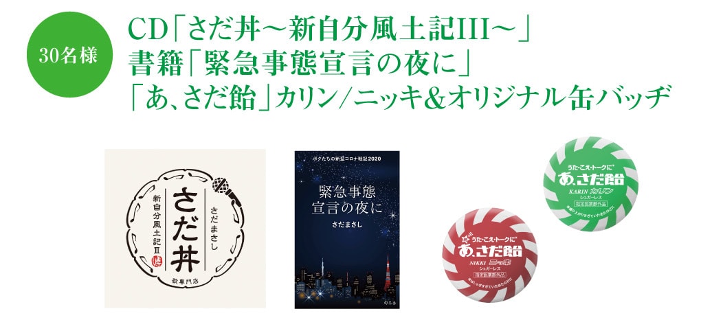 | ■賞品 | 下記をセットで30名様にプレゼントいたします。 ・「さだ丼~新自分風土記Ⅲ~」 ・「緊急事態宣言の夜に ボクたちの新型コロナ戦記2020」 ・「あ、さだ飴」カリン、ニッキ(販売名:浅田飴薬用のど飴K/N<指定医薬部外品>) ・「あ、さだ飴」オリジナル缶バッヂ2種 |
