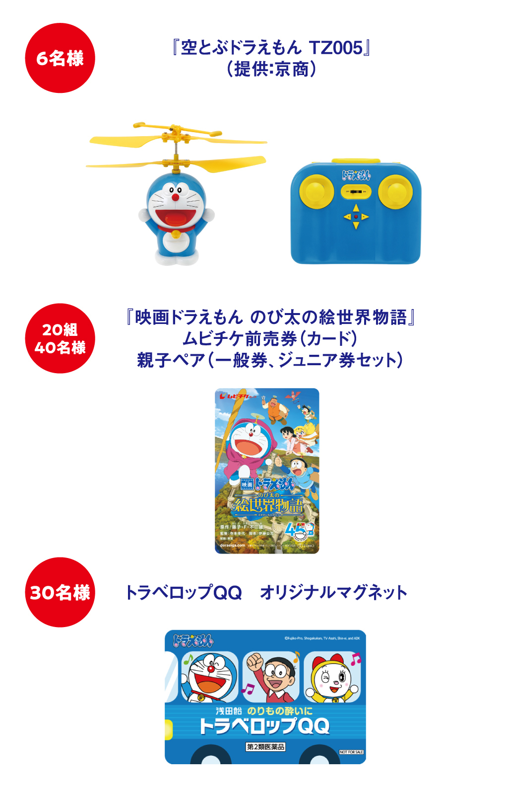 | ■賞品 | ・空とぶドラえもん TZ005(提供:京商)・・・6名様 ・『映画ドラえもん のび太の絵世界物語』 ・トラベロップQQ オリジナルマグネット・・・30名様 |