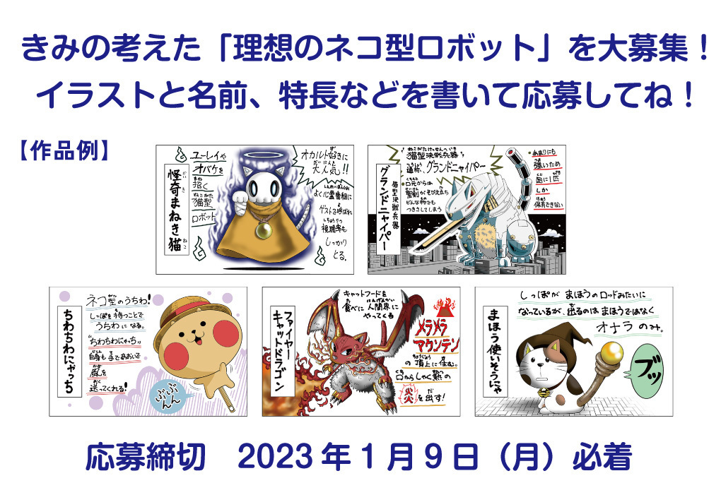 | ■応募方法 | 応募用紙をダウンロードして、きみが考えた「理想のネコ型ロボット」のイラストとその特長などを書いてWEB、もしくは郵送で応募してください。 ※応募用紙は下のアイコンをクリックするとダウンロードできます。 |