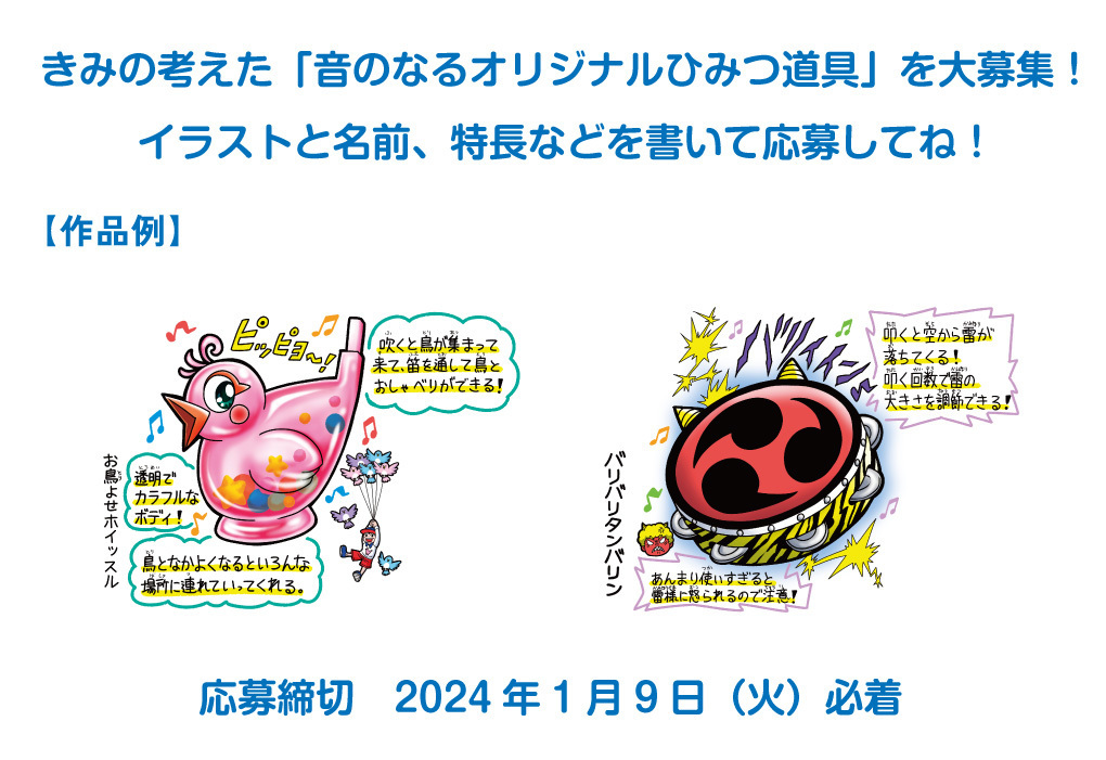 | ■応募方法 | 応募用紙をダウンロードして、きみが考えた「音のなるオリジナルひみつ道具」のイラストとその特長などを書いてWEB、もしくは郵送で応募してください。 ※応募用紙は下のアイコンをクリックするとダウンロードできます。 |
