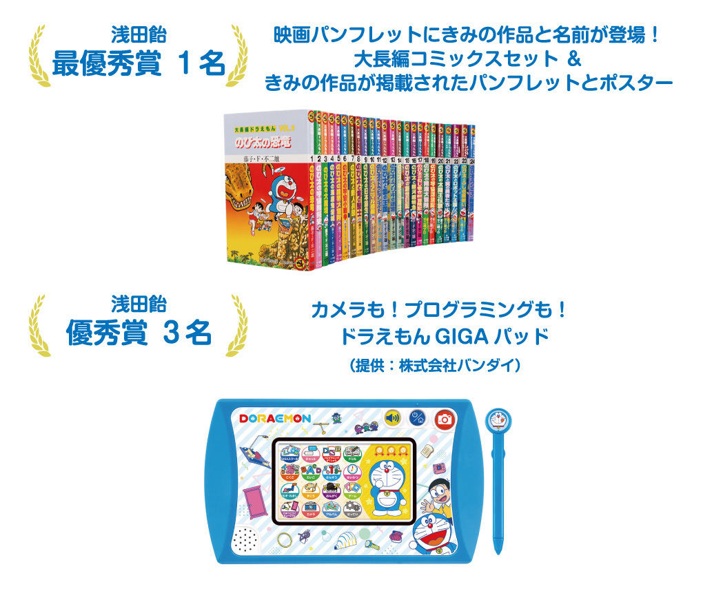 | ■選考について | ・厳正な審査の上、入賞作品を決定します。 ・作品は未発表のオリジナルなものに限ります。他の著作物・アイデアに著しく類似している場合、受賞が取り消される場合があります。 ・作品は返却いたしません。 ・作品の著作権は主催者に帰属します。 ・作者は作品についての著作者人格権は行使しないものとします。 ・同種のアイデアの応募があった場合は、抽選とさせていただきます。 ・住所、氏名、電話番号の記入漏れや不備がある場合は受賞の対象となりません。 ・最優秀賞は浅田飴部門への応募の中から1名となります。 ・主催:「映画ドラえもん」イラストコンテスト実行委員会 |