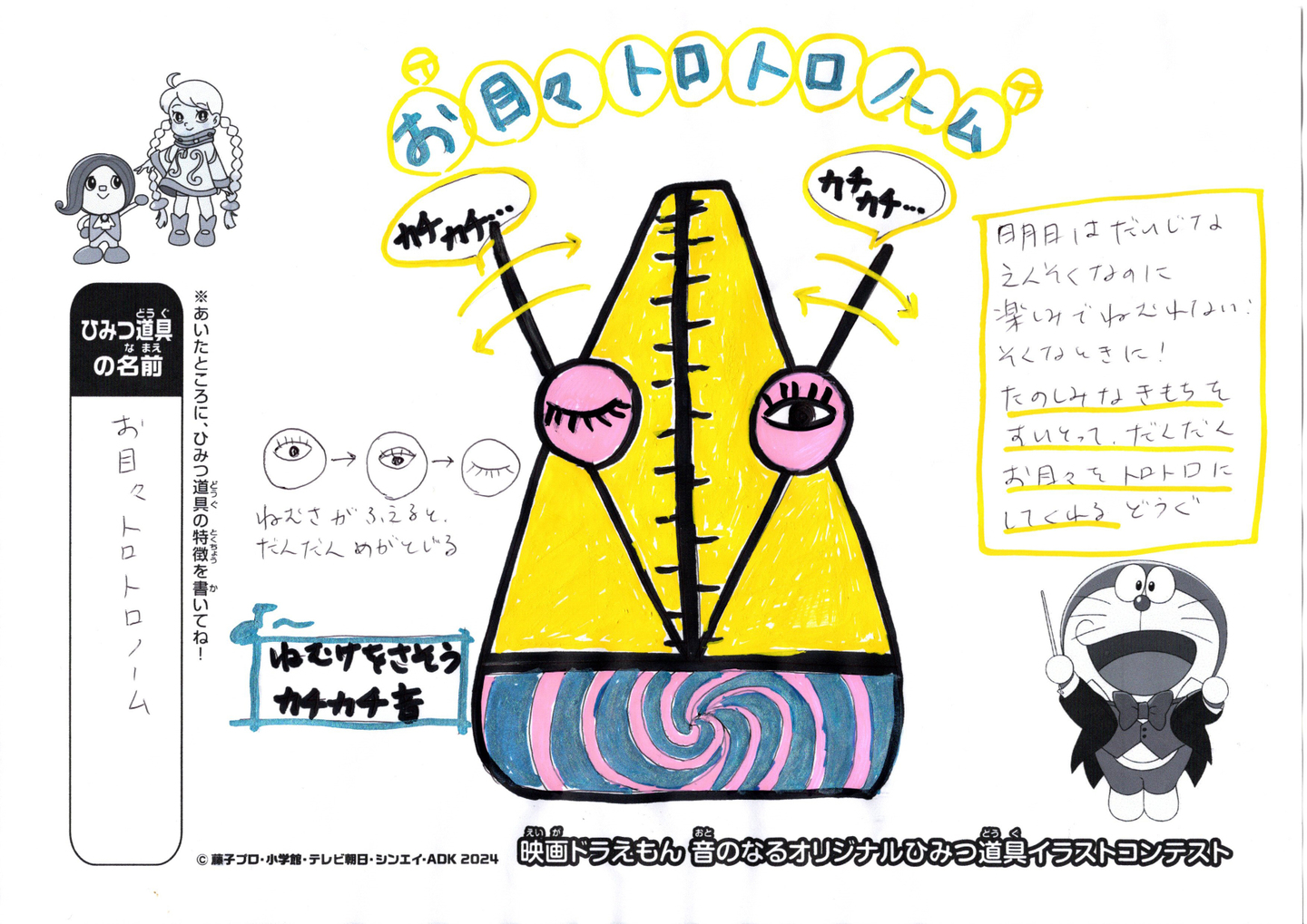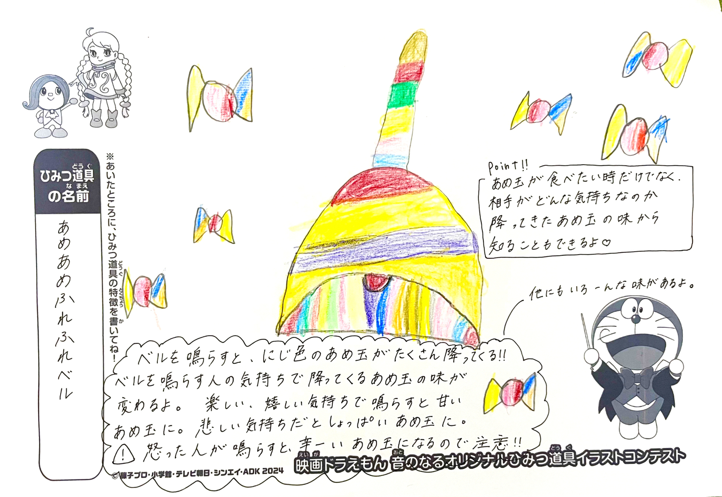 <郵送でのご応募> 〒171-0052 東京都豊島区南長崎3-1-5 株式会社浅田飴 映画ドラえもん 「音のなるオリジナルひみつ道具イラストコンテスト」係 |