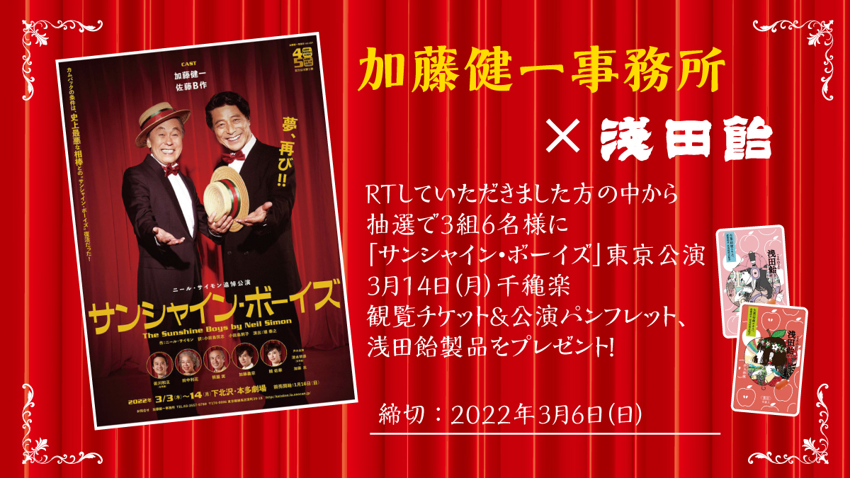 【応募用ツイート】このツイートをRT(フォローは不要です。)で、加藤健一事務所「サンシャイン・ボーイズ」3/14(月)千穐楽チケット&パンフレットと浅田飴製品を3組6名様にプレゼント🎁✨