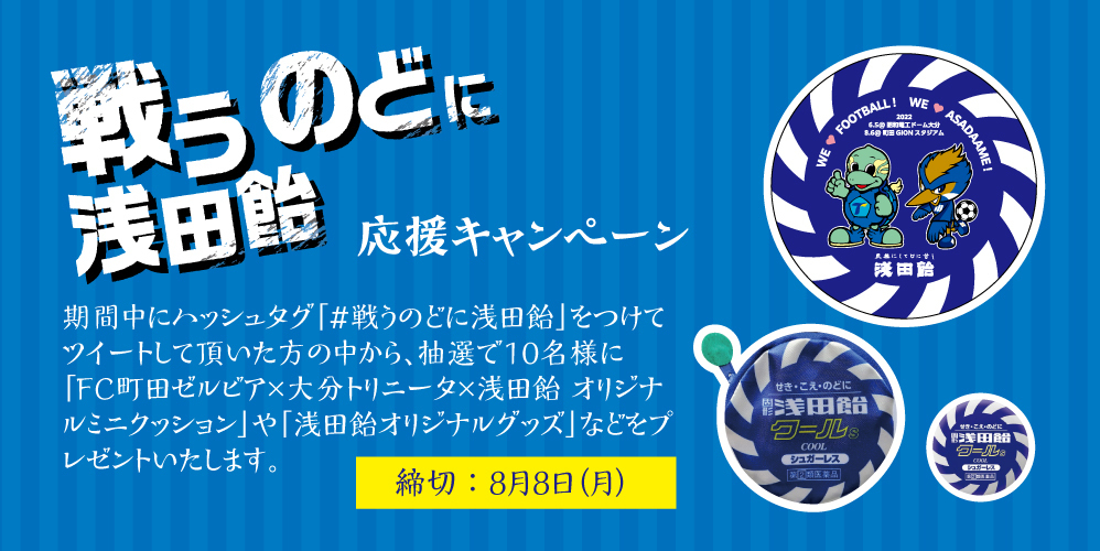 | ■賞品 | ・FC町田ゼルビア×大分トリニータ×浅田飴 オリジナルミニクッション…10名様 ・浅田飴オリジナルポーチ&缶バッヂ、浅田飴ガードドロップ…10名様 (販売名:アサダアメガードドロップGR<指定医薬部外品>) |