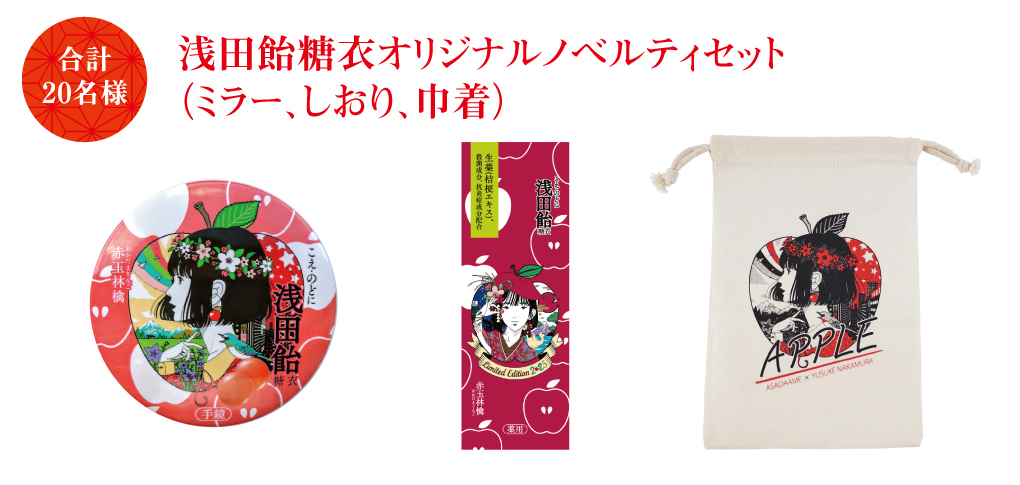 | ■賞品 | A賞 直筆サイン入り「中村佑介カレンダー2025」・・・各回10名様、合計20名様 B賞 浅田飴糖衣オリジナルノベルティセット(ミラー、しおり、巾着)・・・各回10名様、合計20名様 |