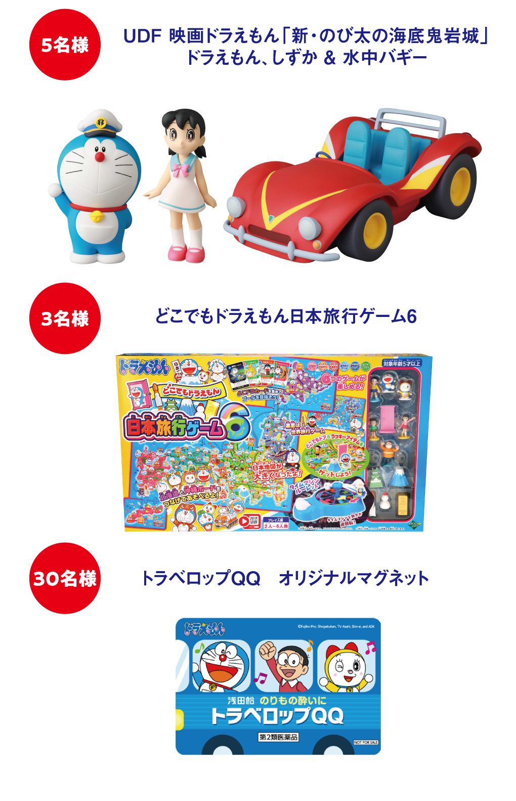 | ■賞品 | ・UDF 映画ドラえもん「新・のび太の海底鬼岩城」 ドラえもん、しずか&水中バギー・・・5名様 ・どこでもドラえもん日本旅行ゲーム6 対象年齢(5歳~)・・・3名様 ・トラベロップQQ オリジナルマグネット・・・30名様 |