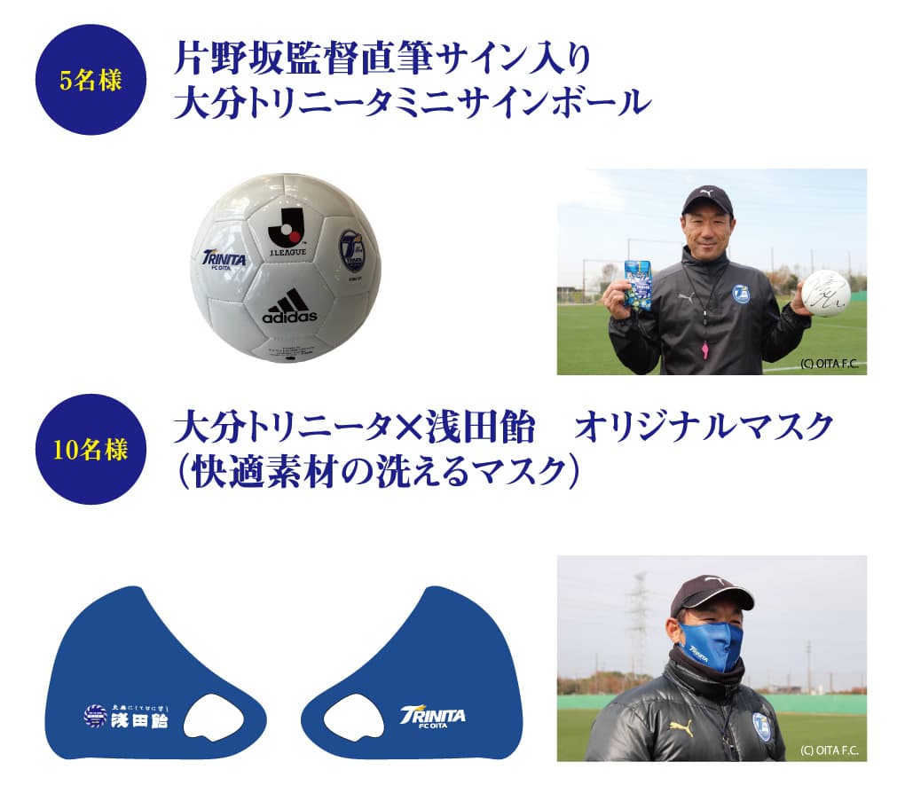 | ■賞品 | ・片野坂監督サイン入りミニボール・・・・5名様 ・大分トリニータ×浅田飴 オリジナルマスク(快適素材の洗えるマスク)…10名様 |