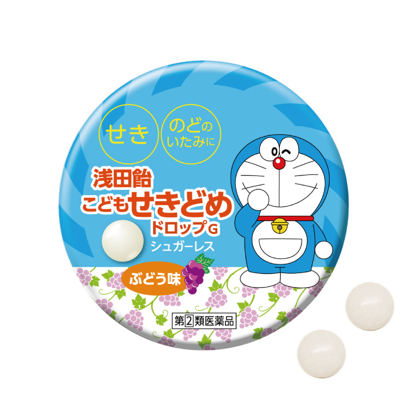 「浅田飴子供せきどめドロップ」は、dl-メチルエフェドリン塩酸塩など3種の有効成分を配合した、つらいせきやたん、のどの痛みに効く鎮咳去痰薬です。カロリーや糖分が気になる方も服用できるシュガーレスのドロップタイプ。ぶどう味でメントールは入っておらず、にがいお薬が苦手なお子さまも服用できる「良薬にして口に甘し」なお薬です。