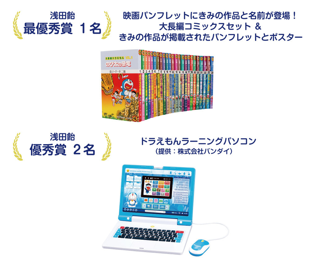■選考について | ・厳正な審査の上、入賞作品を決定します。 ・作品は未発表のオリジナルなものに限ります。他の著作物・アイデアに著しく類似している場合、受賞が取り消される場合があります。 ・作品は返却いたしません。 ・作品の著作権は主催者に帰属します。 ・作者は作品についての著作者人格権は行使しないものとします。 ・同種のアイデアの応募があった場合は、抽選とさせていただきます。 ・住所、氏名、電話番号の記入漏れや不備がある場合は受賞の対象となりません。 ・最優秀賞は浅田飴部門への応募の中から1名となります。 ・主催:「映画ドラえもん」イラストコンテスト実行委員会 |