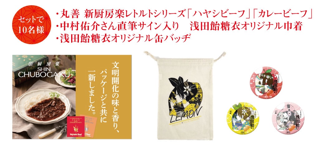| ■賞品 | 下記をセットで10名様に ・丸善 新厨房楽レトルトシリーズ「ハヤシビーフ」「カレービーフ」 ・中村佑介さん直筆サイン入り 浅田飴糖衣オリジナル巾着(檸檬) ・浅田飴糖衣オリジナル缶バッヂ |