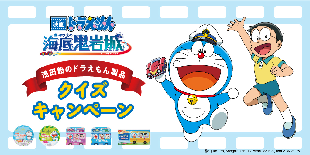 HOME 浅田飴のドラえもん製品 クイズキャンペーン 浅田飴のドラえもんシリーズに関するクイズに答えて『映画ドラえもん 新・のび太の海底鬼岩城』映画観賞券(ムビチケ)などをプレゼント! 応募締切:2026年2月16日(月) 詳しくはこちら 浅田飴糖衣キャンペーン 「浅田飴糖衣」の対象製品を購入、応募してくださった方の中から抽選で合計40名様に「浅田飴糖衣」オリジナルグッズなどをプレゼントいたします。 応募締切:2025年12月31日(水) 詳しくはこちら キミが考えた海のいきものイラストコンテスト きみの考えたオリジナルの海のいきものを大募集!イラストと名前、特長などを書いて応募してね!最優秀作品は映画のパンフレットに掲載! 応募締切:2026年1月7日(水) 詳しくはこちら #浅田飴ぬりえ コンテスト 2025年11月に発売予定の「浅田飴糖衣P(白桃)Limited Edition 2026」パッケージイラストのぬりえを大募集! 応募締切:2025年10月14日(火) 詳しくはこちら 浅田飴こども読み聞かせ会に親子100名様をご招待! 11月22日(土)文京区の文化シヤッターBXホールにて開催!読み聞かせや参加劇など、ちょっと早いクリスマスを親子で楽しみましょう! 応募締切:2025年9月30日(火) 詳しくはこちら 戦うのどに浅田飴 応援キャンペーン 9/20(土)大分トリニータvsレノファ山口FC(@クラサスドーム大分)にて浅田飴ブースを出展!対象商品の購入でオリジナルタオルをプレゼント! 試合開催日:2025年9月20日(土) 詳しくはこちら トラベロップQQ 楽しい旅行を応援キャンペーン 4月10日は「酔い止めの日」!トラベロップQQに関するクイズに答えて「どこでもドラえもん日本旅行ゲーム6」などをプレゼント! 応募締切:2025年4月30日(水) 詳しくはこちら 浅田飴のドラえもん製品 クイズキャンペーン 浅田飴のドラえもんシリーズに関するクイズに答えて『映画ドラえもん のび太の絵世界物語』映画観賞券(ムビチケ)などをプレゼント! 応募締切:2025年2月20日(木) 詳しくはこちら 絵にまつわるひみつ道具 絵のコンクール きみの考えた「絵にまつわるひみつ道具」を大募集!イラストと名前、特長などを書いて応募してね!きみの名前が映画のエンドロールに! 応募締切:2025年1月8日(水) 詳しくはこちら 浅田飴糖衣キャンペーン 「浅田飴糖衣」の対象製品を購入、応募してくださった方の中から抽選で合計40名様に「浅田飴糖衣」オリジナルグッズなどをプレゼントいたします。 第1回締切:2024年11月30日(土)/ 第2回締切:2024年12月31日(火) 詳しくはこちら #浅田飴ぬりえ コンテスト 2024年11月に発売予定の「浅田飴糖衣R(赤玉林檎)Limited Edition 2025」パッケージイラストのぬりえを大募集! 応募締切:2024年9月30日(月) 詳しくはこちら おおいたとのご縁キャンペーン 大分に関わる4社をフォロー&応募用ポストをリポストで、各社製品の詰め合わせをレゼント! 応募締切:2024年9月12日(木) 詳しくはこちら トラベロップQQ 楽しい旅行を応援キャンペーン 4月10日は「酔い止めの日」!トラベロップQQに関するクイズに答えて「ドラえもん ポケット人生ゲーム ひみつ道具で大冒険!」などをプレゼント! 応募締切:2024年4月22日(月) 詳しくはこちら 浅田飴のドラえもん製品 クイズキャンペーン 浅田飴のドラえもんシリーズに関するクイズに答えて『映画ドラえもん のび太の地球交響楽(ちきゅうシンフォニー)』映画観賞券(ムビチケ)などをプレゼント! 応募締切:2024年2月20日(火) 詳しくはこちら 音のなるオリジナルひみつ道具イラストコンテスト きみの考えた「音のなるオリジナルひみつ道具」を大募集!イラストと名前、特長などを書いて応募してね!最優秀作品は映画のパンフレットに掲載! 応募締切:2024年1月9日(火) 詳しくはこちら 11/22 桂小すみ ひとり会 にご招待! 全国の大人と子どもが笑いでつながる!桂小すみ ひとり会 ~第8回「声」でつながる演芸会~のオンライン配信視聴チケットをプレゼント! 応募締切:2023年11月14日(火) 詳しくはこちら シュガーカット50周年キャンペーン 第3弾 シュガーカットは今年で発売50周年!感謝を込めて、ロカボやレトロな賞品が当たるプレゼントキャンペーンを実施中です! 応募締切:2023年12月31日(日) 詳しくはこちら 浅田飴糖衣キャンペーン 「浅田飴糖衣」の対象製品を購入、応募してくださった方の中から抽選で合計40名様に「浅田飴糖衣」オリジナルグッズなどをプレゼントいたします。 第1回締切:2023年11月30日(木)/ 第2回締切:2023年12月31日(日) 詳しくはこちら 浅田飴こども読み聞かせ会に親子100名様をご招待! 10月28日(土)文京区の文化シヤッターBXホールにて開催!ハロウィンにちなんだ人形劇や読み聞かせ、参加劇など親子で楽しみましょう! 応募締切:2023年9月30日(土) 詳しくはこちら #浅田飴ぬりえ コンテスト 2023年11月に発売予定の「浅田飴糖衣L(檸檬)Limited Edition 2024」パッケージイラストのぬりえを大募集! 応募締切:2023年10月25日(水) 詳しくはこちら シュガーカット50周年キャンペーン シュガーカットは今年で発売50周年!感謝を込めて、ロカボやレトロな賞品が当たるプレゼントキャ