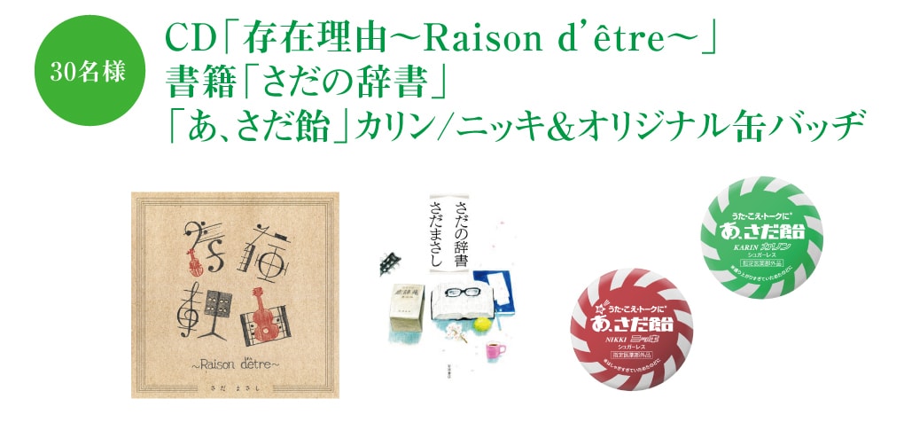 | ■賞品 | 下記をセットで30名様にプレゼントいたします。 ・「存在理由〜Raison d' être~」 ・「さだの辞書」 ・「あ、さだ飴」カリン、ニッキ(販売名:浅田飴薬用のど飴K/N<指定医薬部外品>) ・「あ、さだ飴」オリジナル缶バッヂ2種 |