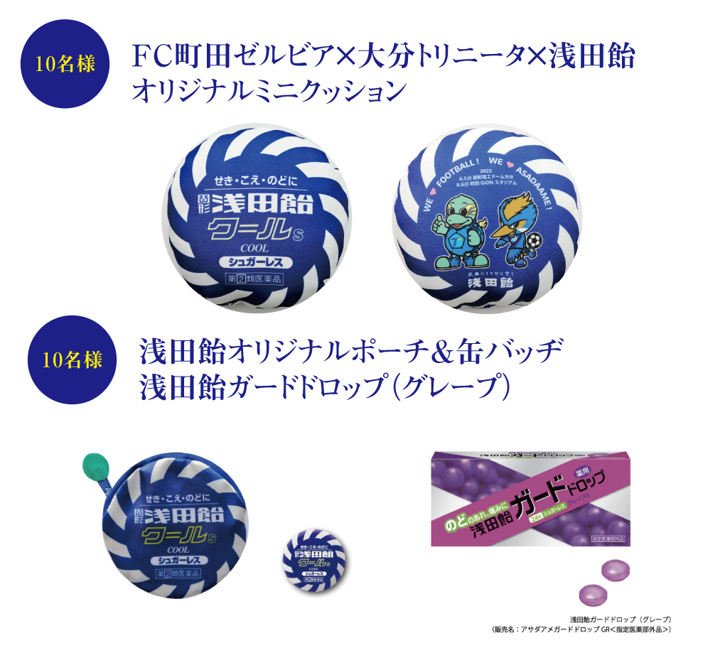 | ■賞品 | ・FC町田ゼルビア×大分トリニータ×浅田飴 オリジナルミニクッション…10名様 ・浅田飴オリジナルポーチ&缶バッヂ、浅田飴ガードドロップ…10名様 (販売名:アサダアメガードドロップGR<指定医薬部外品>) |