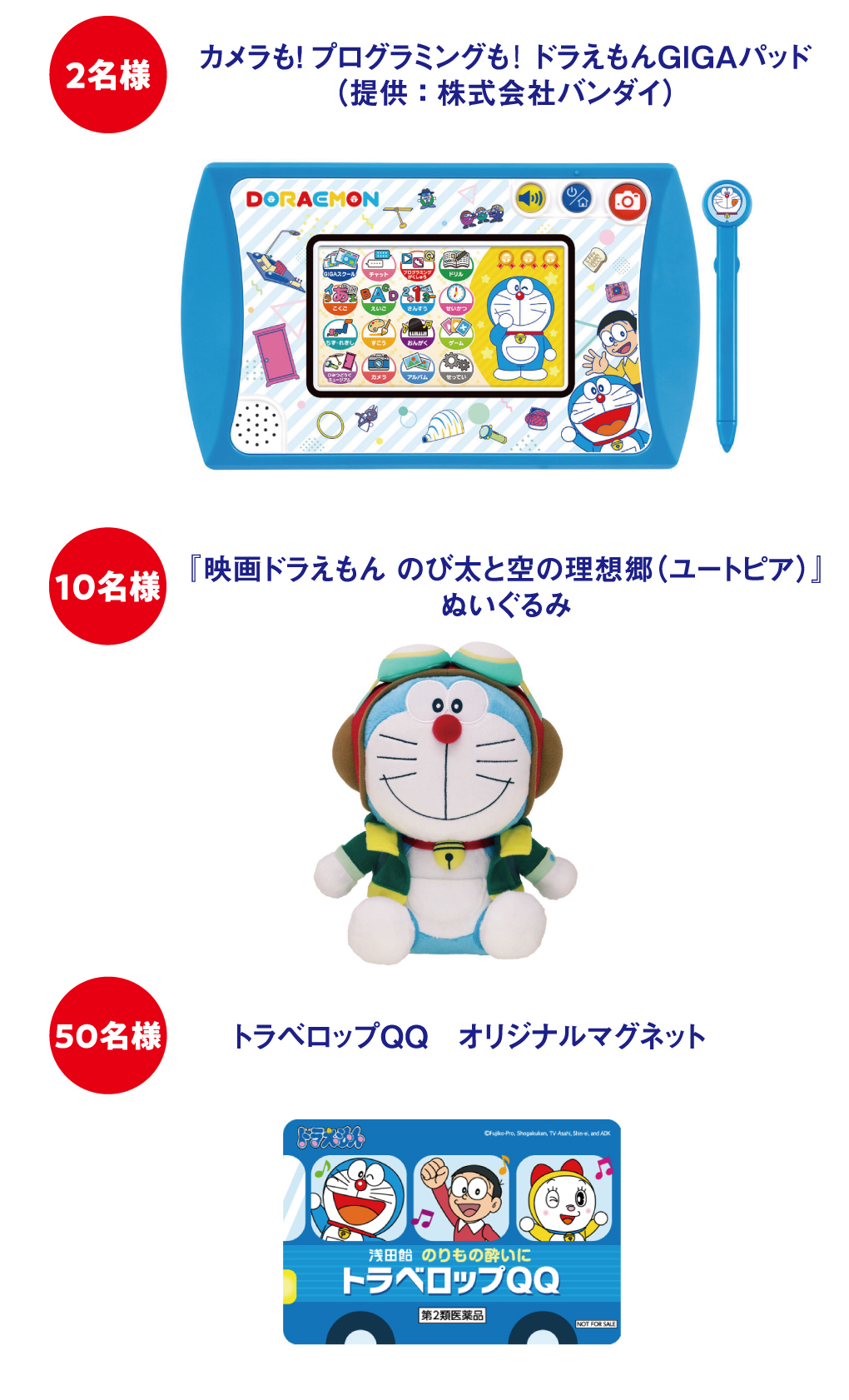 ■賞品 | ・カメラも!プログラミングも! ドラえもんGIGAパッド・・・2名様 ・『映画ドラえもん のび太と空の理想郷(ユートピア)』ぬいぐるみ・・・10名様 ・トラベロップQQ オリジナルマグネット・・・50名様 |