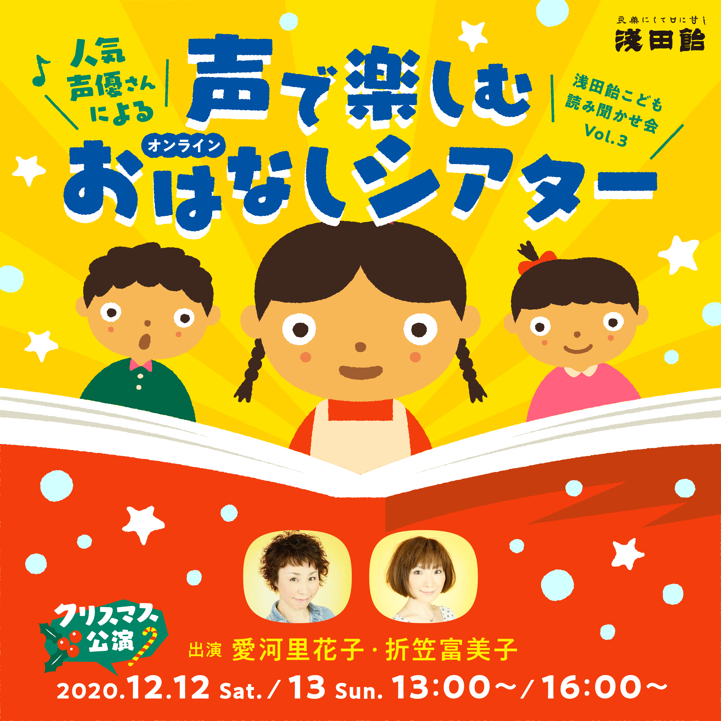 ■公演日時 | 2020年12月12日(土)13時~/16時~ 2020年12月13日(日)13時~/16時~ ※45分前に開場いたします。画面表示の名前をお子さんの下のお名前やあだ名(ひらがな)、イニシャルにしてお待ちください。 ※公演時間はおよそ1時間を予定しております。 |