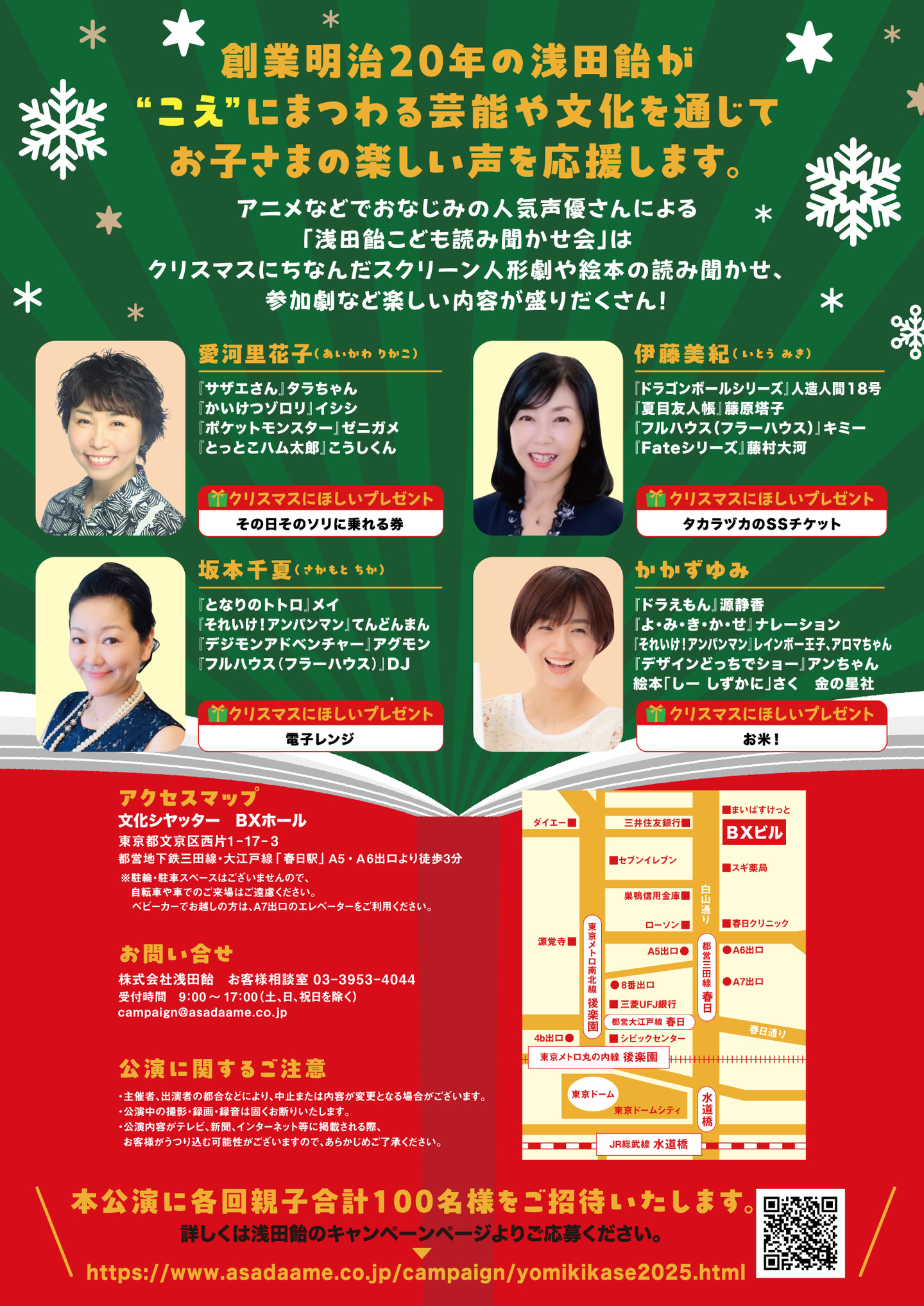 | ■公演内容 | 声優さんによるスクリーン人形劇や絵本の読み聞かせ、参加劇などを予定 ※小学生くらいまでのお子さまを対象とした公演内容を予定しております。 ※公演中の退席は自由ですので、小さいお子さまをお連れの方もぜひご参加ください。 |